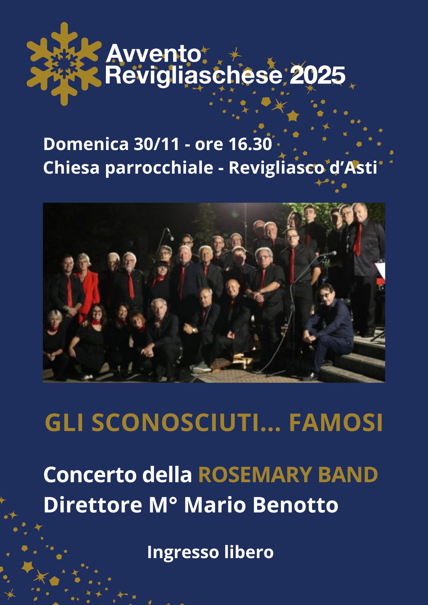 Un pomeriggio di musica e di emozioni vi attende a Revigliasco d’Asti, dove la Rosemary Band vi invita a un viaggio sonoro tra le melodie che hanno segnato la storia della canzone e della televisione italiana. Il concerto, dal titolo “Gli sconosciuti... famosi”, nasce con l’intento di far conoscere al pubblico quegli eccellenti maestri e compositori italiani che, pur avendo regalato al nostro paese brani immortali, sono rimasti spesso nell’ombra dei grandi interpreti.