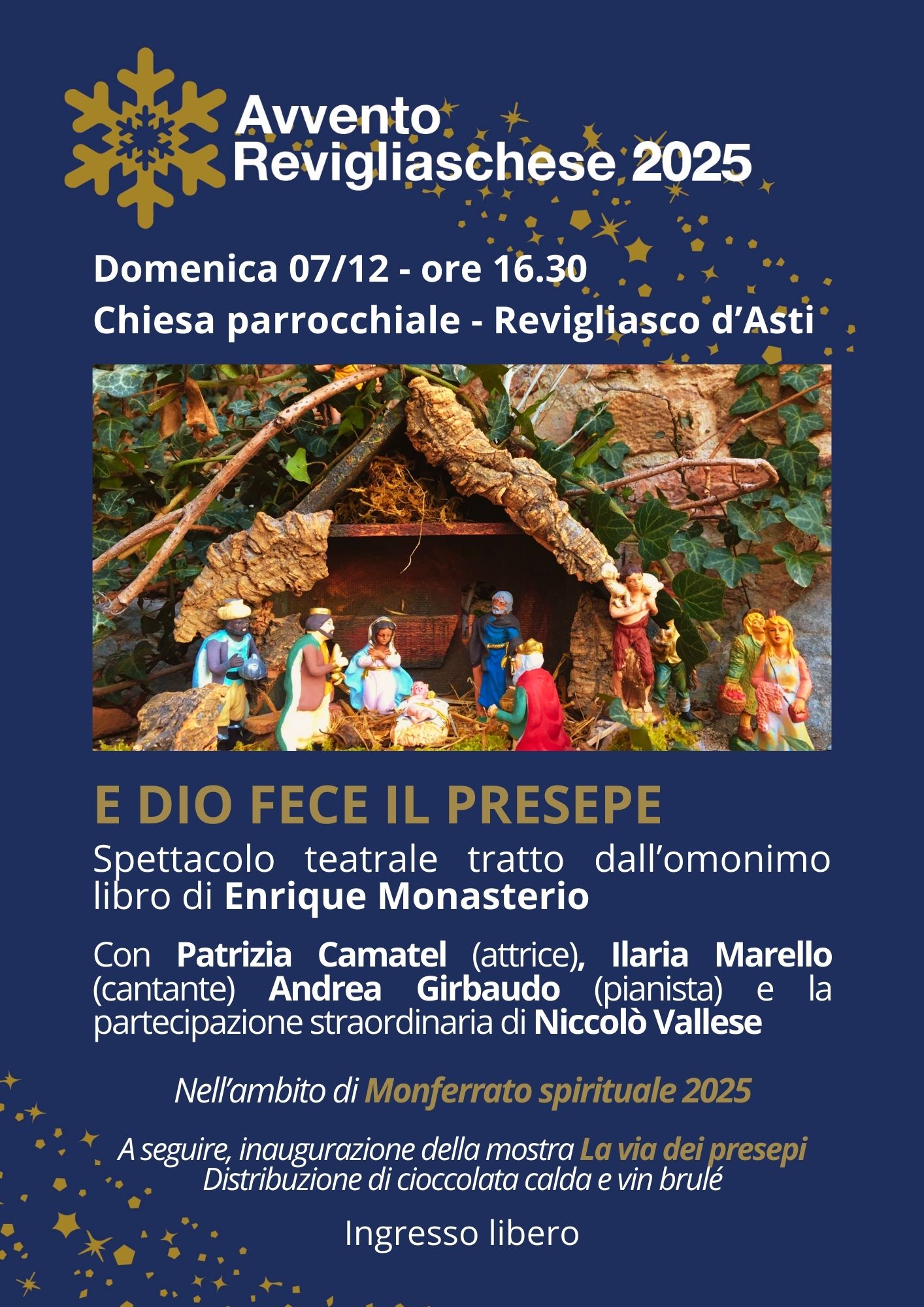 “E Dio fece il presepe” è una lettura interpretata tratta dall’omonima opera di Enrique Monasterio, un testo poetico e profondo che ci accompagna nel cuore della Creazione come nel cuore di Betlemme. A dar voce alle pagine più intense del libro sarà Patrizia Camatel, attrice di rara sensibilità interpretativa, accompagnata dalla voce limpida della cantante Ilaria Marello e dalle note evocative del Maestro Andrea Girbaudo alla tastiera.
