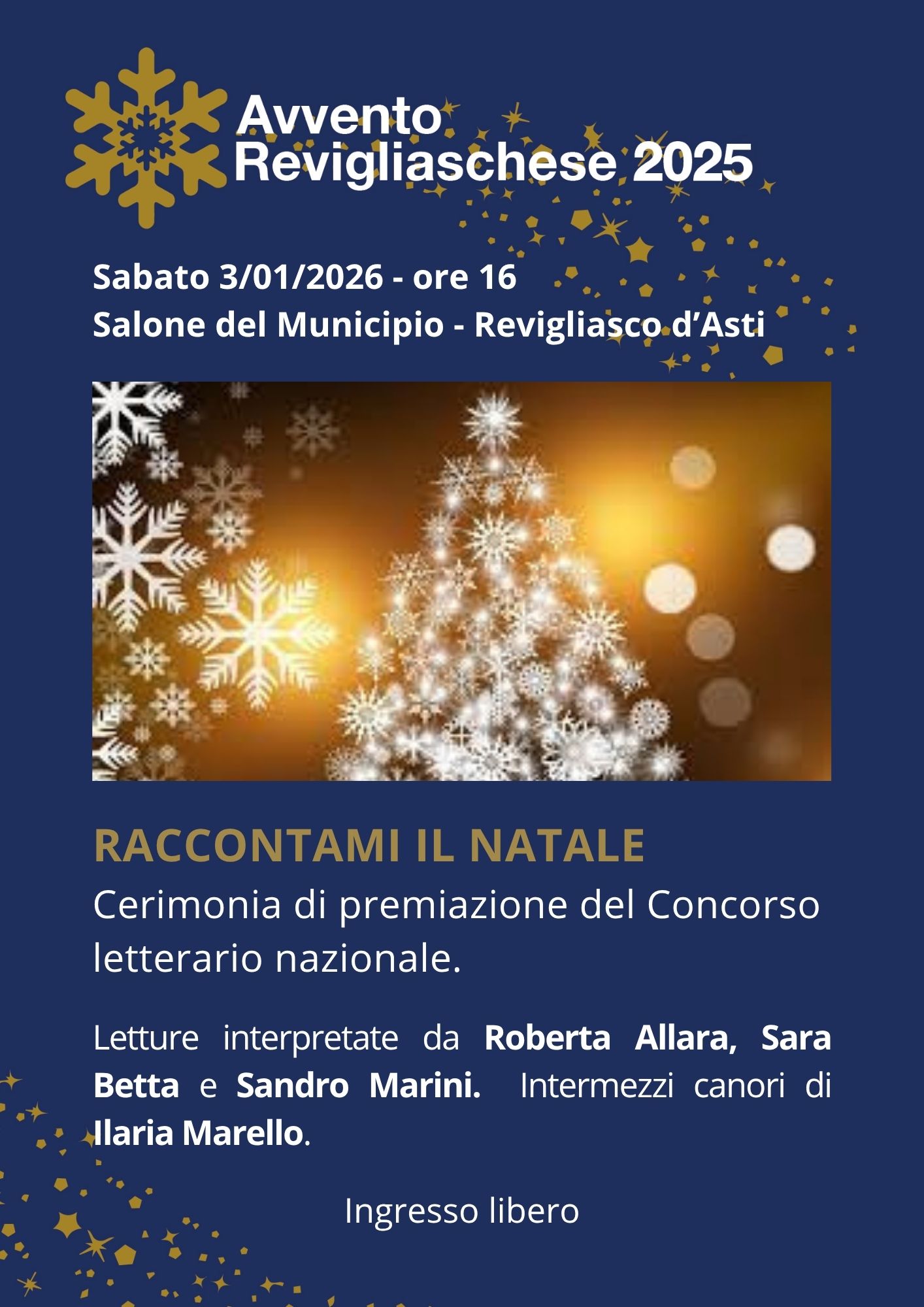 Al termine della rassegna “Avvento Revigliaschese 2025”, il Comune di Revigliasco d’Asti, in collaborazione con la Parrocchia e con il Patrocinio del Progetto culturale della Diocesi di Asti, invita tutti alla cerimonia di premiazione della sesta edizione del Concorso letterario nazionale “Raccontami il Natale”. Attraverso questa iniziativa, l’Ente organizzatore ha voluto dare voce a una riflessione creativa capace di raccontare il valore spirituale e umano del Natale: non solo come evento da celebrare, ma come sentimento che continua a vivere e a trasformarsi dentro di noi.